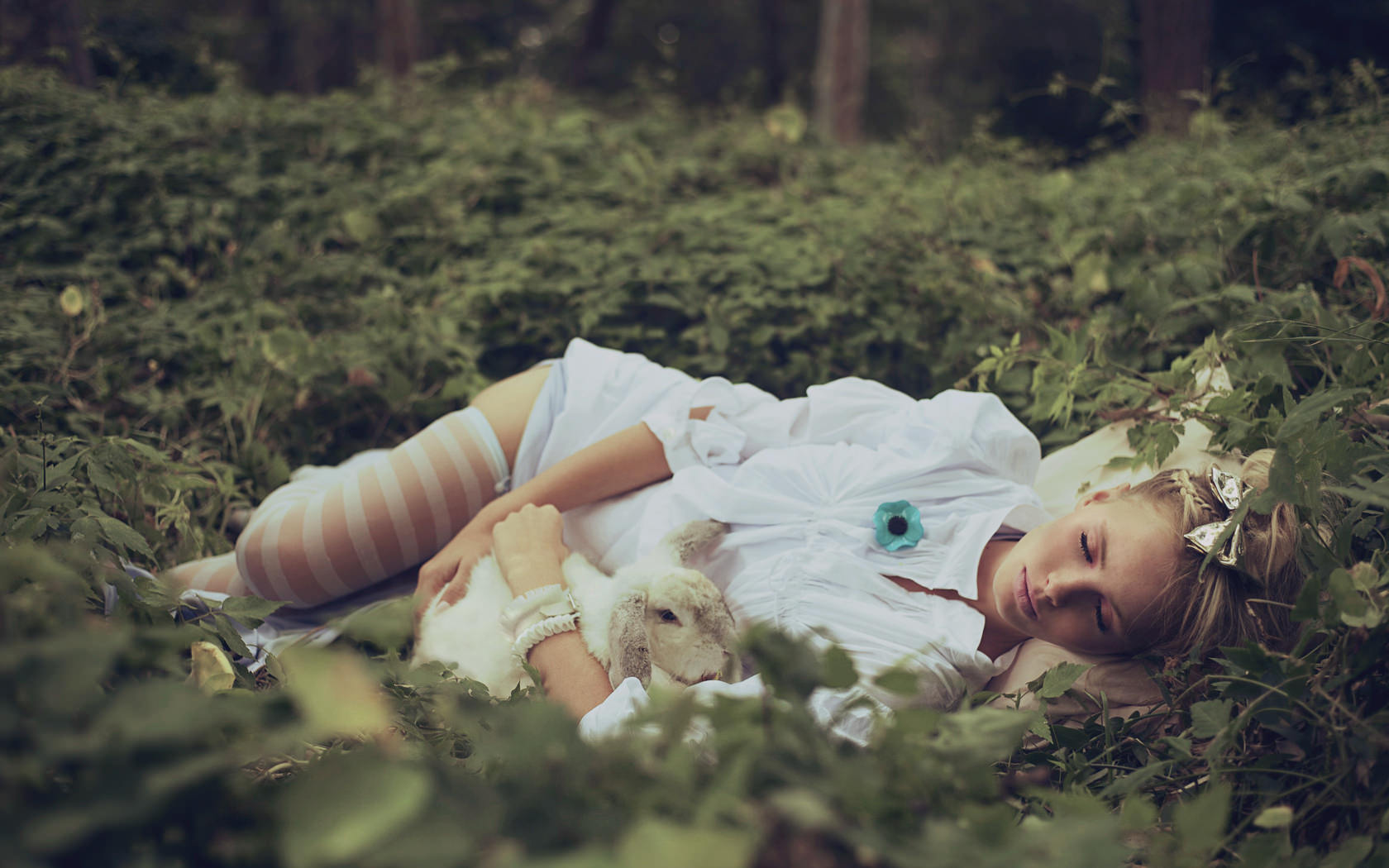 Красивая, светловолосая, девушка, уснула, в, лесу, в, траве, полосатые, чулки, белая, одежка, и, маленькая, овечка, justgirls, (1056)
