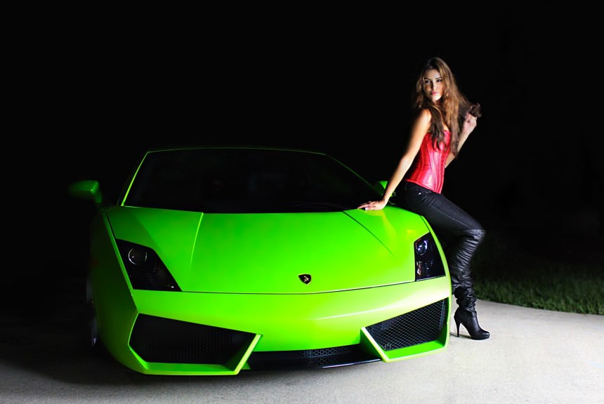 Девушка, в, красном, корсете, и, черных, штанах, возле, зеленого, Ламборджини, в, темноте, на, дороге