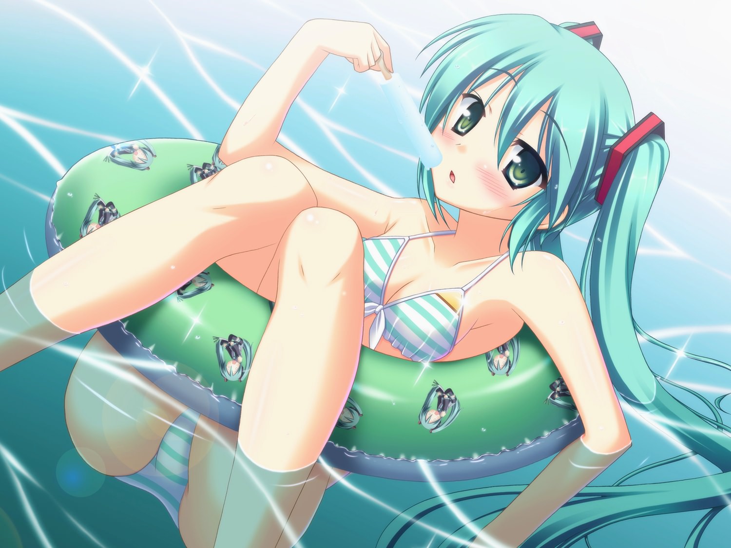 Девушка купается в бассейне в надувном круге, полосатые трусики, попа в воде, есть мороженное.