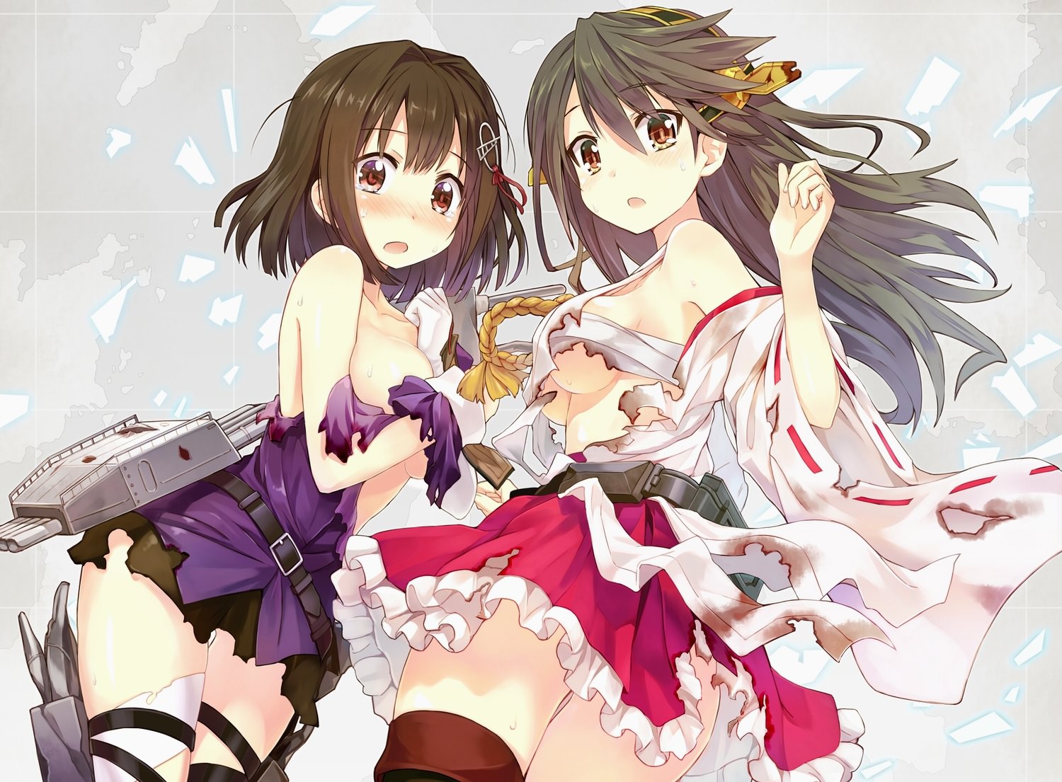 Ошеломленные девушки в порванным платьях, хорошие сиськи у них, юбки.
