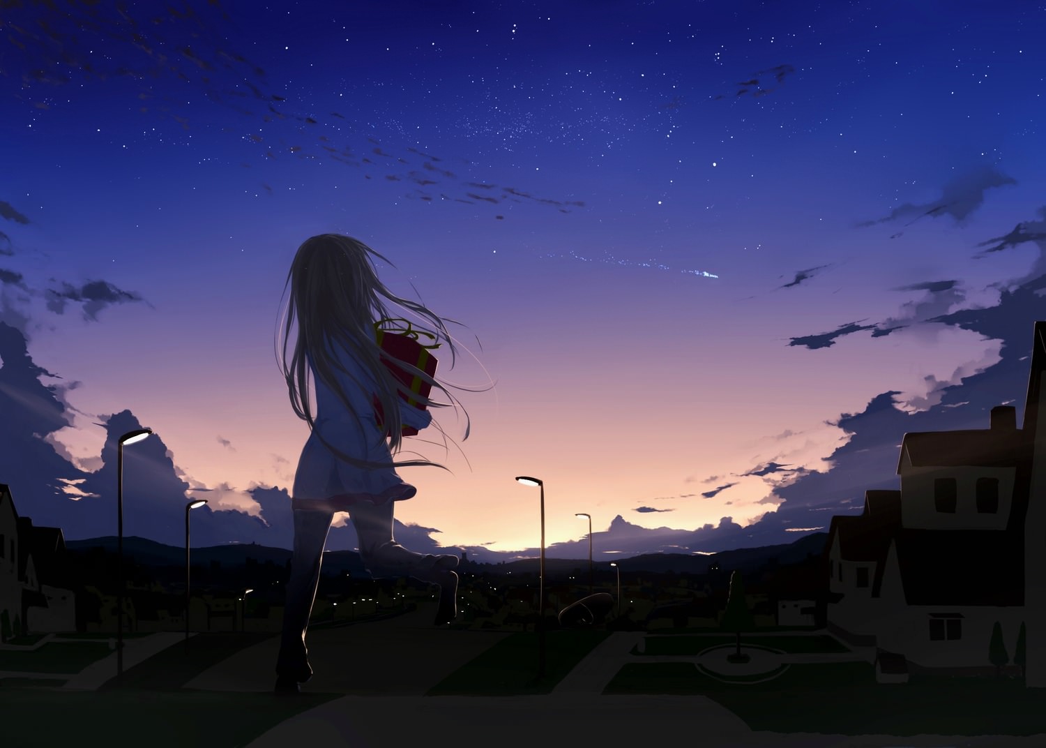 Светловолосая, девушка, с, подарком, в, руках, смотрит, на, закат, в, городе, аллея, фонари, дома