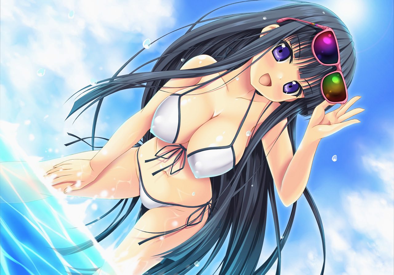 Симпатичная, девушка, в, белом, бикини, сиськи, вырываются, из, лифчика, яркие, очки, милая, улыбка, девушка, с, длинными, темными, волосами, на, море