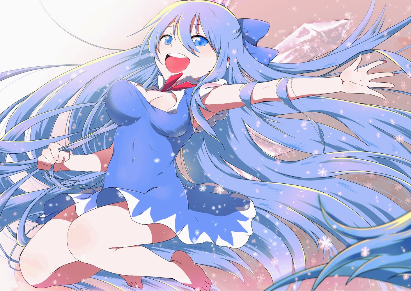 Веселая длинноволосая девушка в синем платье, жизнерадостная улыбающаяся девушка с очень длинными синими волосами, сиськи трясутся.