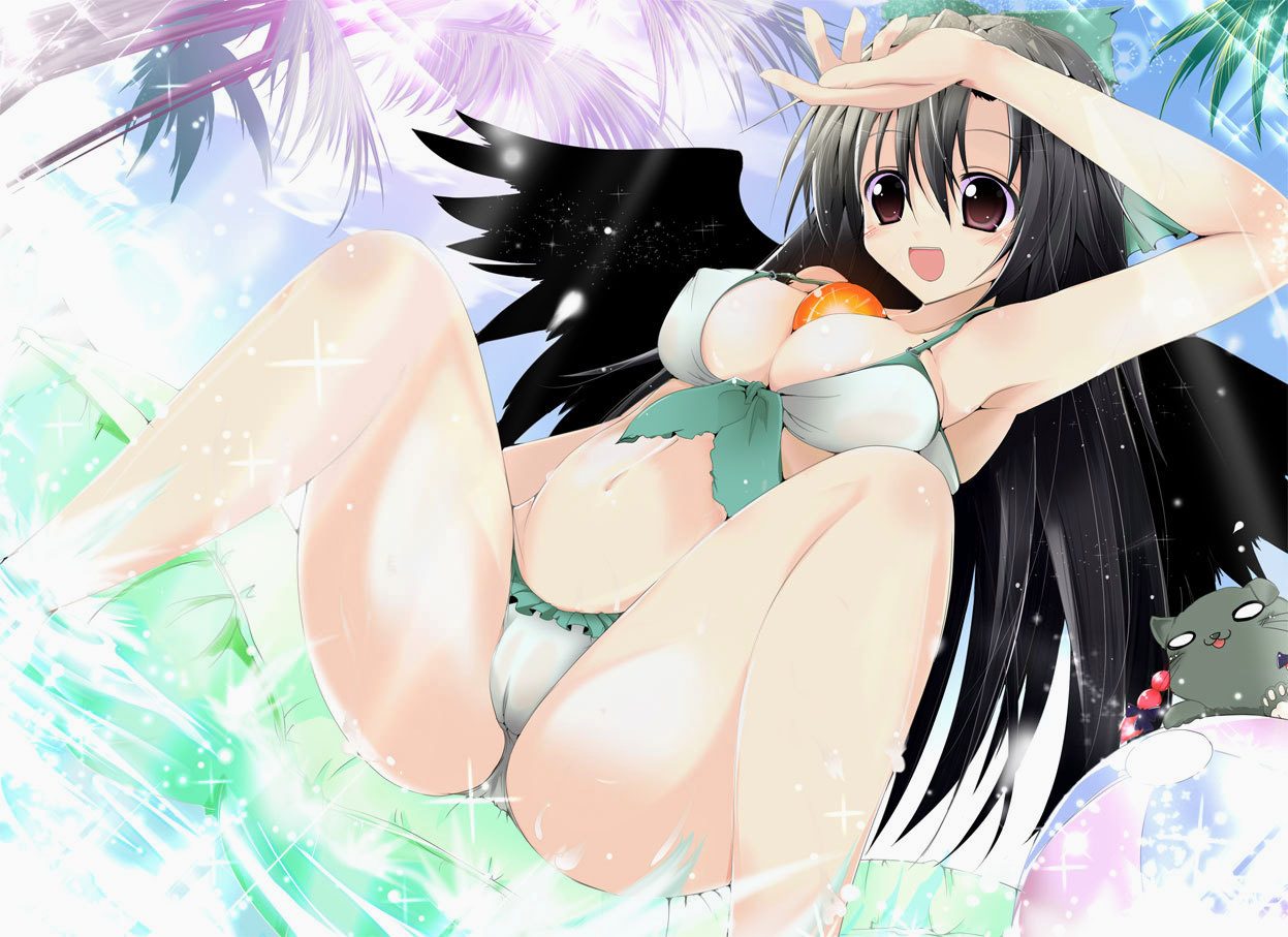 Сексуальная девушка в бикини, апельсин между сисек, раздвинула ножки, черные крылья за спиной, классные сиськи в лифчике бикини.