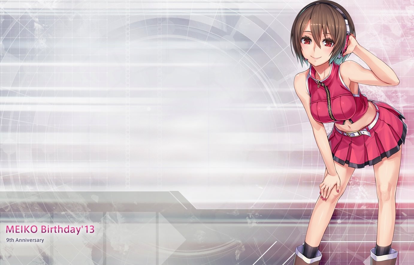 Милая девушка в красной мини юбке радостно слушает музыку в наушниках, Meiko.