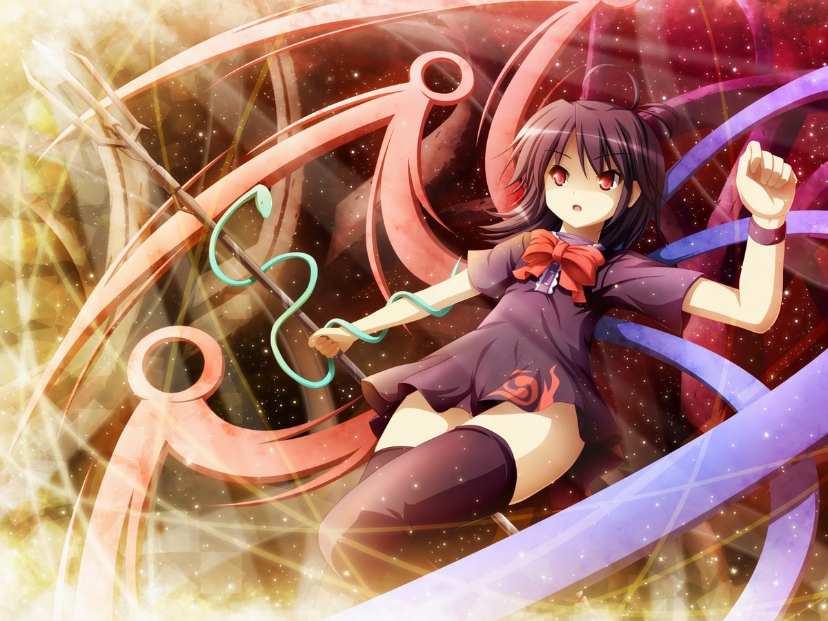 Девушка с трезубцем и змеей на руке, школьное платье и черные чулки.