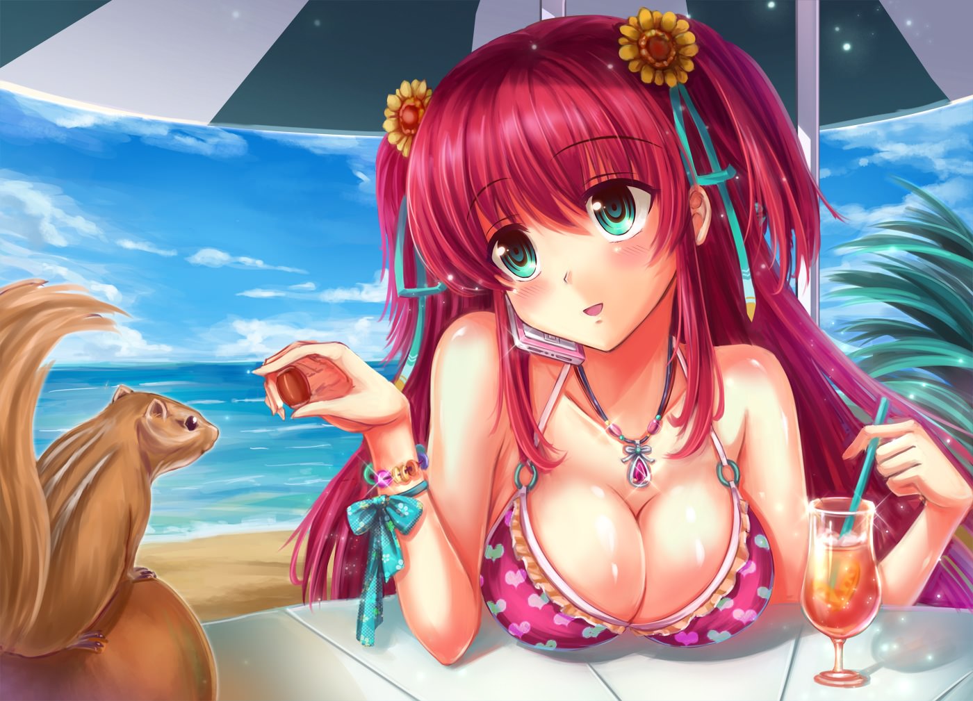 Очаровательная девушка с большими сиськами в бикини на пляже распивает коктейль, кормит белку орешком, девушка в бикини с большой грудью, на море, под зонтом, красные волосы, милые зеленые глазки.