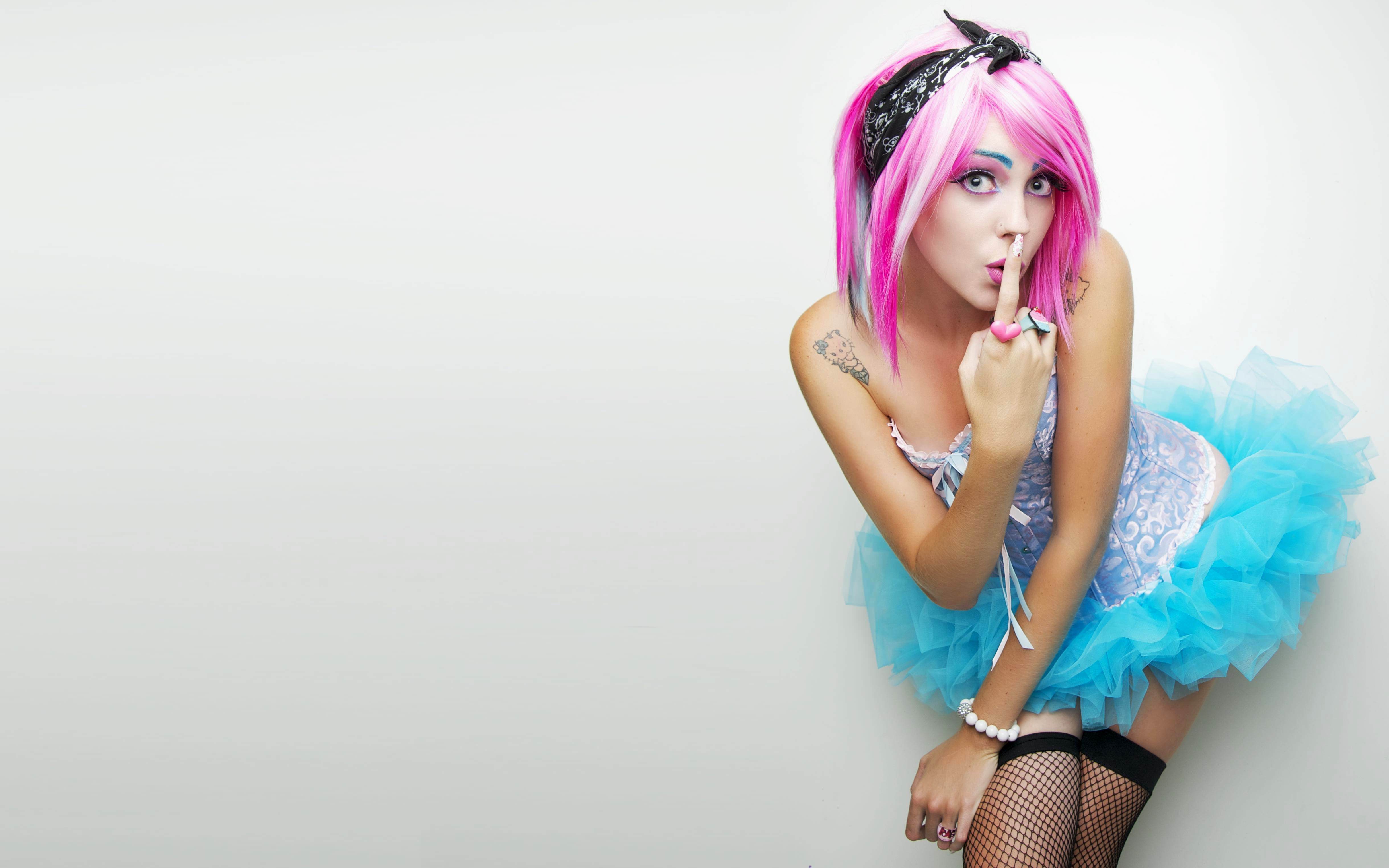 Забавная, девушка, в, голубом, платье, и, чулочках, розовые, волосы, приложила, пальчик, к, губам, justgirls, (1074)
