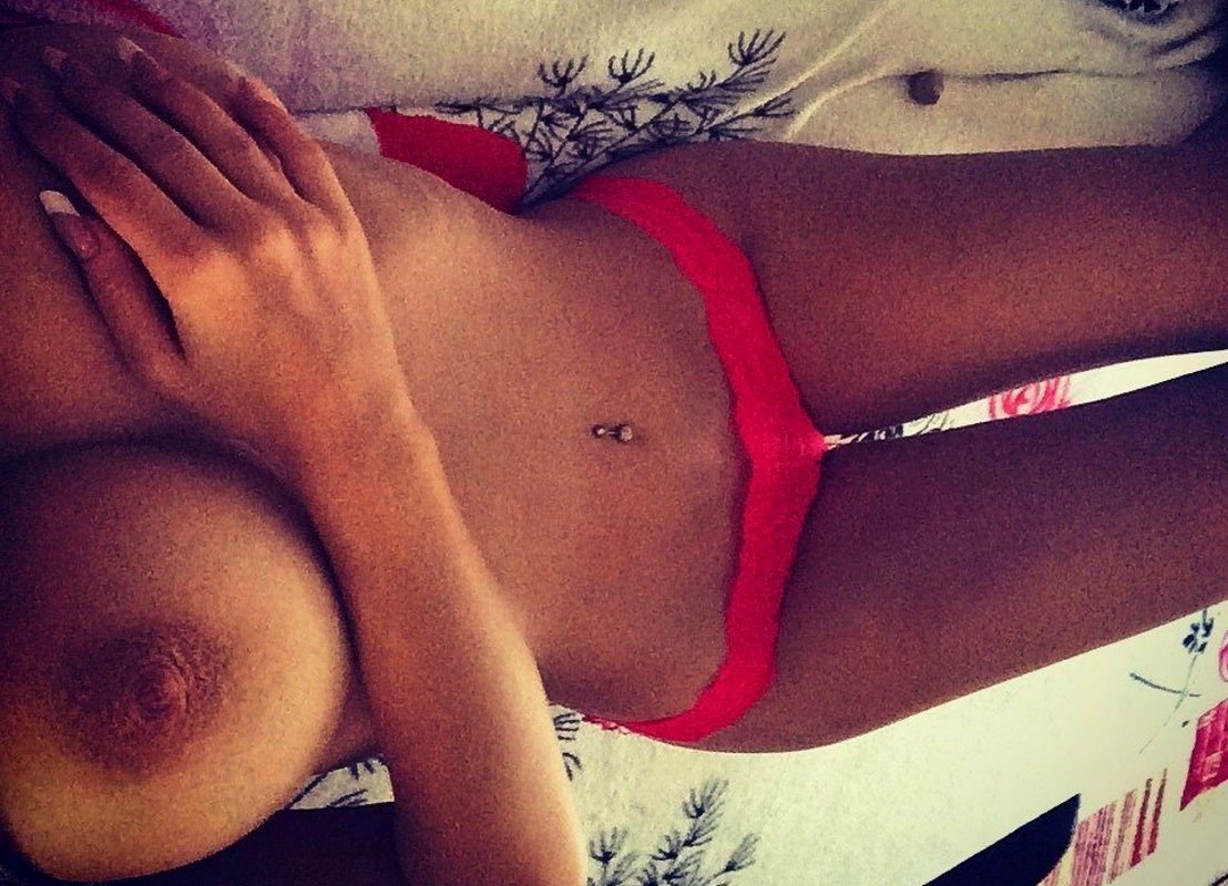 Молодая девушка в розовых эротичных трусиках мило лежит в своей кроватке с голой грудью, прикрыв рукой одну сиську, пирсинг в пупке, большие голые сиськи, сфотографировала свое сексуальное тело, пышный сосок,erogirls (7906).