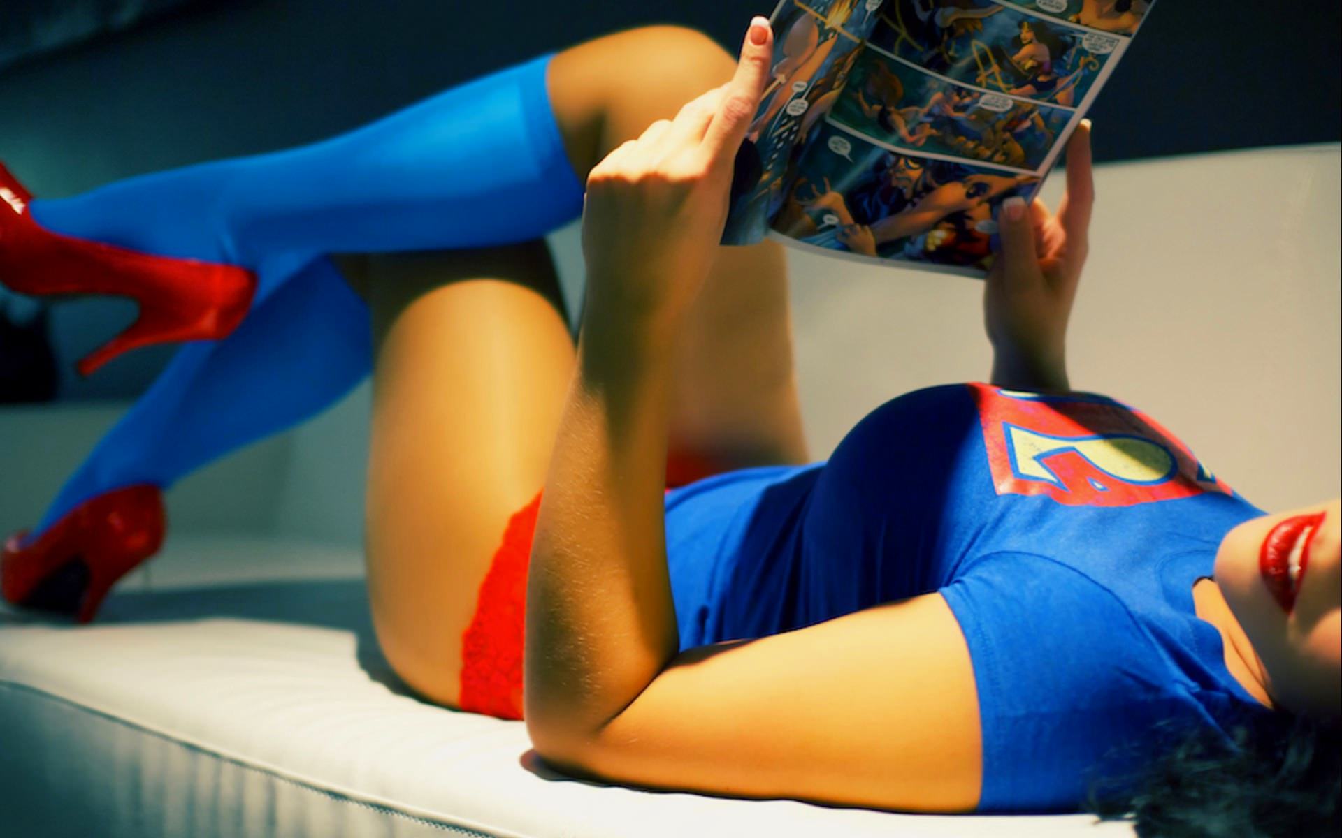 Девушка в футболке супермена, красные трусики, синие носочки и красные туфли, рассматривает комиксы с супер героями, лежа на диване, красные губы, большая грудь, justgirls (1140).
