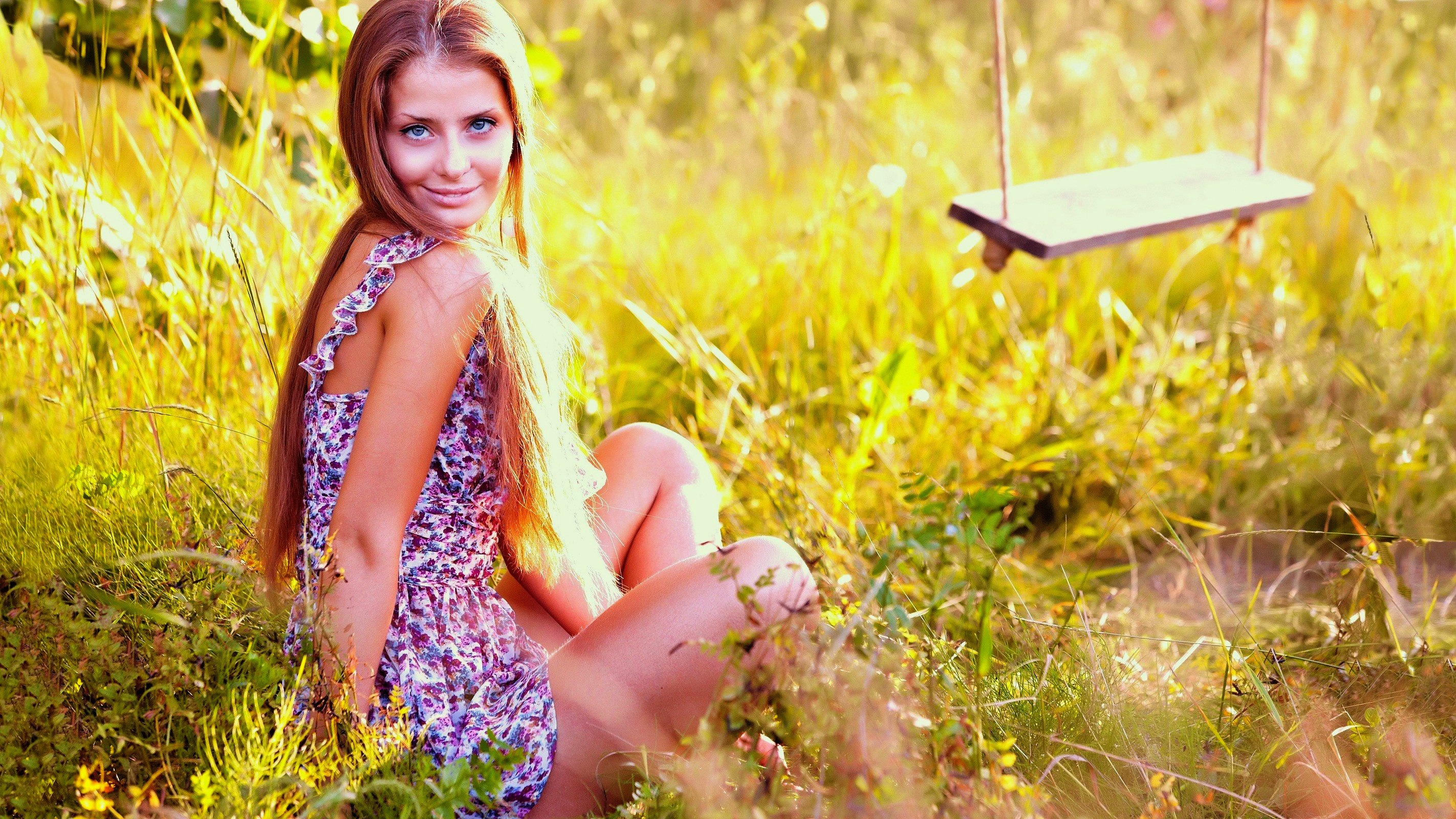 Обаятельная, девушка, в, разноцветном, летнем, платье, сидит, на, траве, лето, качели, на, дереве, длинные, волосы, красотки, красивые, ножки, милая, улыбка, justgirls, (1162)